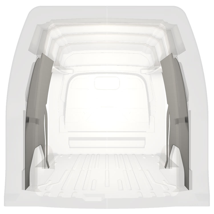Lichtgewicht volledige bekleding voor de binnenwanden van een Ford Transit Custom met dubbele zijportieren. De bekleding zorgt voor een lichte, aangename werkomgeving en is makkelijk schoon te vegen.