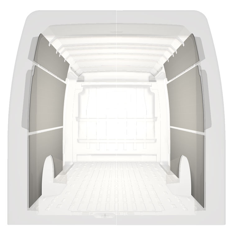 Lichtgewicht voorgesneden bekleding voor de binnenwanden van een Citroën Jumper / Peugeot Boxer / Fiat Ducato met dubbele zijportieren. De bekleding zorgt voor een lichte, aangename werkomgeving en is makkelijk schoon te vegen.