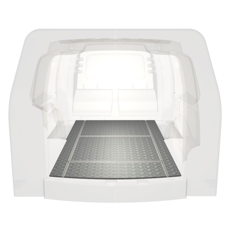 Lichtgewicht, robuuste bestelwagenvloer met dwarsrails voor een Volkswagen Caddy Cargo Maxi 21- met antislip-instaplijst van aluminium en cargorails (in de lengte en in de breedte) voor een snelle en veilige installatie van inrichtingssystemen en andere accessoires.