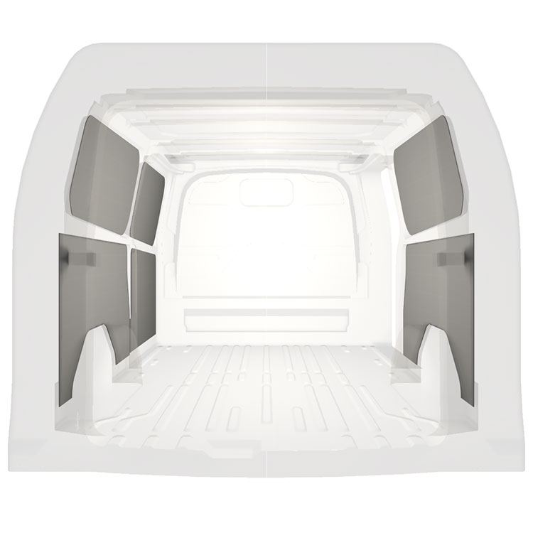 Lichtgewicht paneelbekleding voor de binnenwanden van een Ford Transit Custom met zijportier aan de rechterkant. De bekleding zorgt voor een lichte, aangename werkomgeving en is makkelijk schoon te vegen.