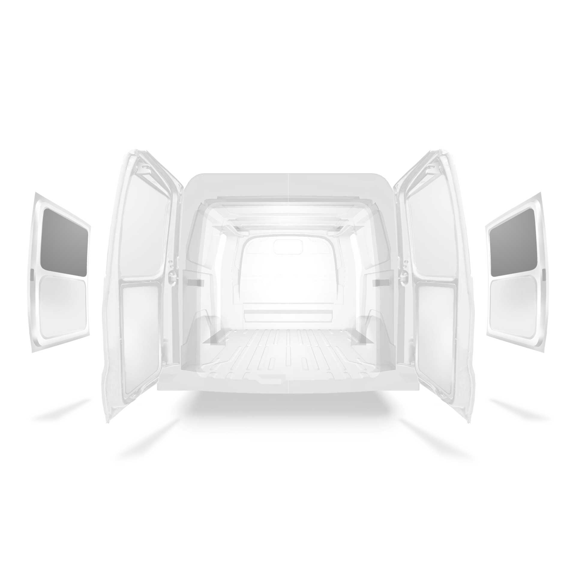 Lichtgewicht bekleding voor het bovenste gedeelte van het zijportier van een Ford Transit Custom met dubbele zijportieren. De bekleding vermindert slijtage van het interieur, en helpt de restwaarde van de bestelbus te behouden.