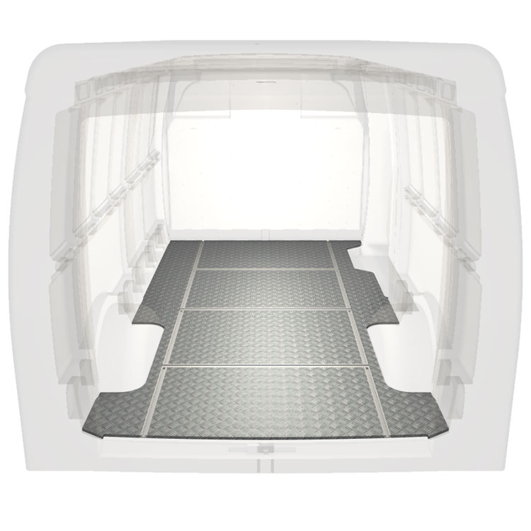 Lichtgewicht, robuuste bestelwagenvloer met dwarsrails voor een Iveco Daily met antislip-instaplijst van aluminium en cargorails (in de lengte en in de breedte) voor een snelle en veilige installatie van inrichtingssystemen en andere accessoires.
