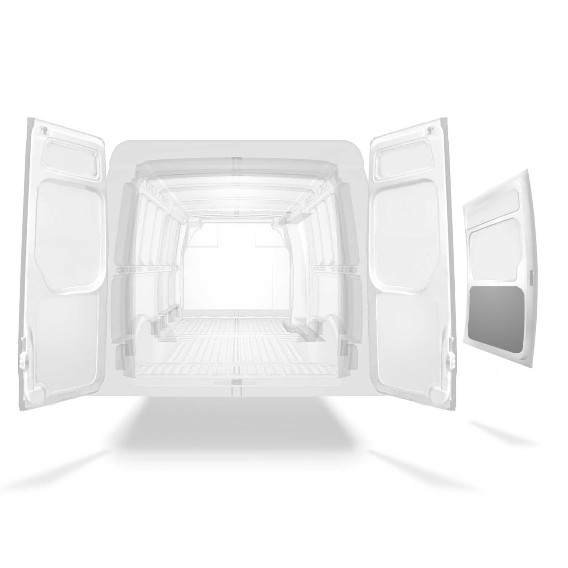 Lichtgewicht bekleding voor het onderste gedeelte van het zijdeur van een Iveco Daily met een zijdeur aan de rechterkant. De bekleding vermindert slijtage van het interieur en helpt om de restwaarde van de bestelwagen te behouden.