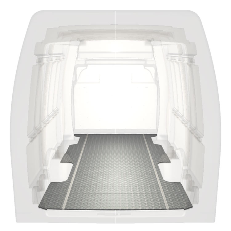 Lichtgewicht, robuuste standaard-bestelwagenvloer voor een Iveco Daily met antislip-instaplijst van aluminium en cargorails (in de lengte) voor een snelle en veilige installatie van inrichtingssystemen en andere accessoires.