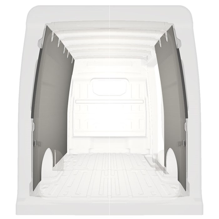 Lichtgewicht volledige bekleding voor de binnenwanden van een Volkswagen Crafter / MAN TGE met een zijportier aan de rechterkant.De bekleding zorgt voor een lichte, aangename werkomgeving en is makkelijk schoon te vegen.