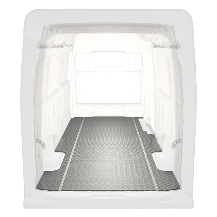 Lichtgewicht, robuuste standaard-bestelwagenvloer voor een Volkswagen Crafter / MAN TGE met antislip-instaplijst van aluminium en cargorails (in de lengte) voor een snelle en veilige installatie van inrichtingssystemen en andere accessoires.