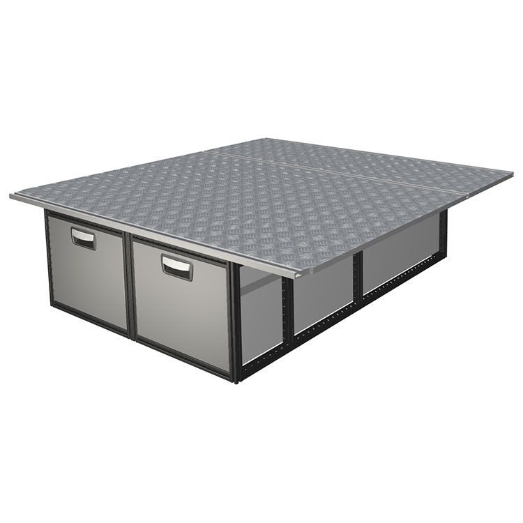 The kit is designed to be fitted on top of a wooden floor. The double floor is equipped with rails for easy installation of vehicle racking, and edging strips for a nice finish.