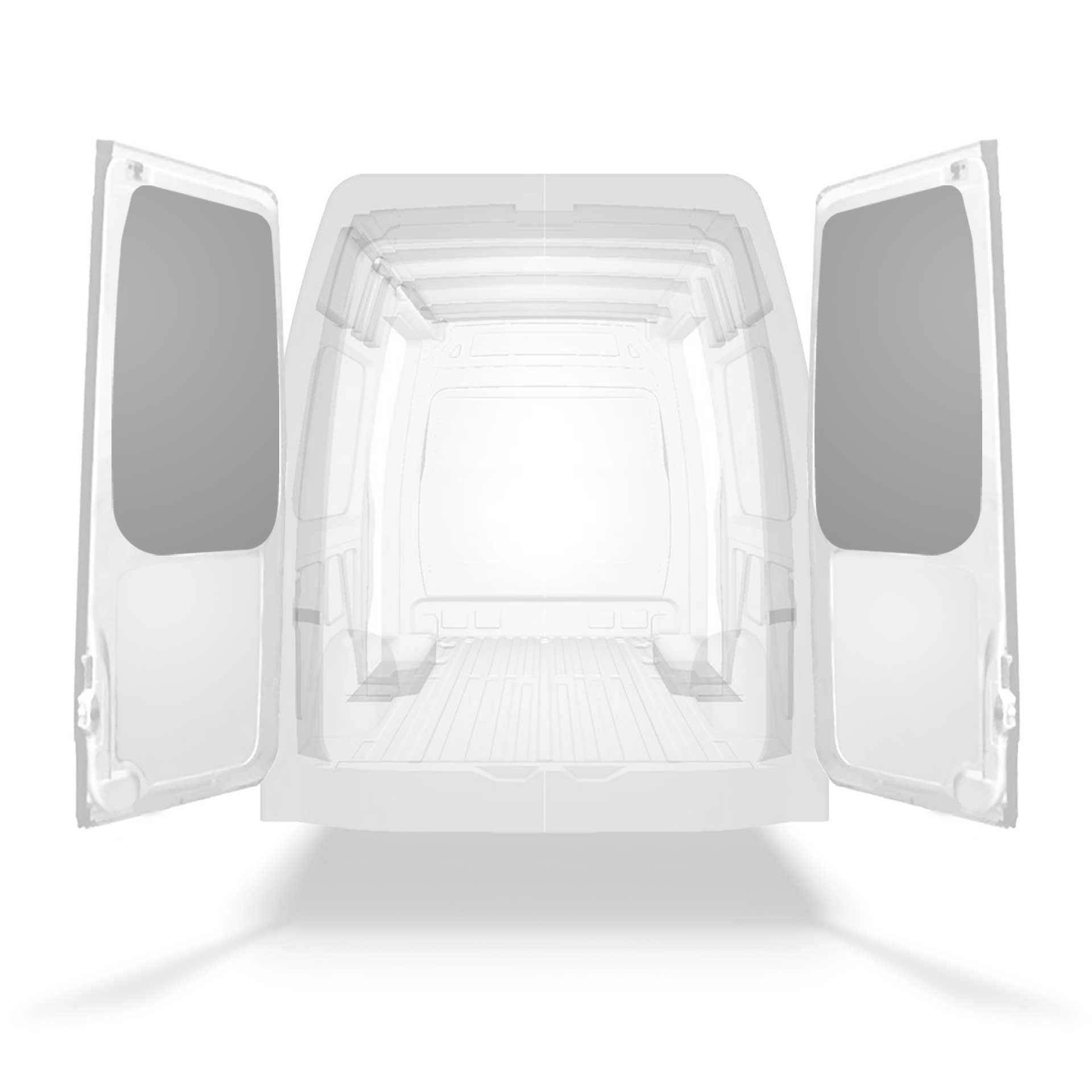 Lichtgewicht bekleding voor het bovenste paneel van het achterportier voor een Mercedes Sprinter met dubbele deuren. De deurbekleding is ontworpen om de binnenkant een professionele afwerking te geven, beschermt de bestelwagen en is eenvoudig schoon te vegen.