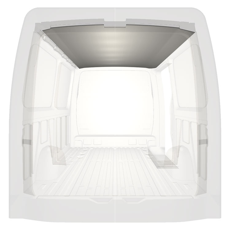 Lichtgewicht bekleding voor het dak van een Mercedes Sprinter. De dakbekleding zorgt voor een lichte, professionele afwerking aan de binnenkant en een aangename werkomgeving.