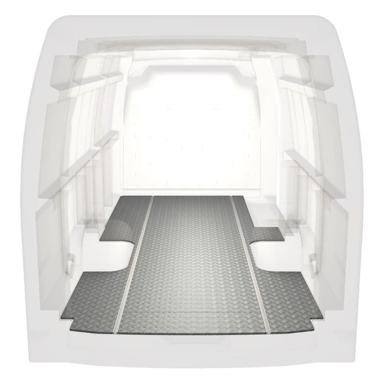 Lichtgewicht, robuuste extra lange vloer voor een Renault Master / Opel Movano / Nissan NV400 met antislip-instaplijst van aluminium en cargorails (in de lengte) voor een snelle en veilige installatie van inrichtingssystemen en andere accessoires.