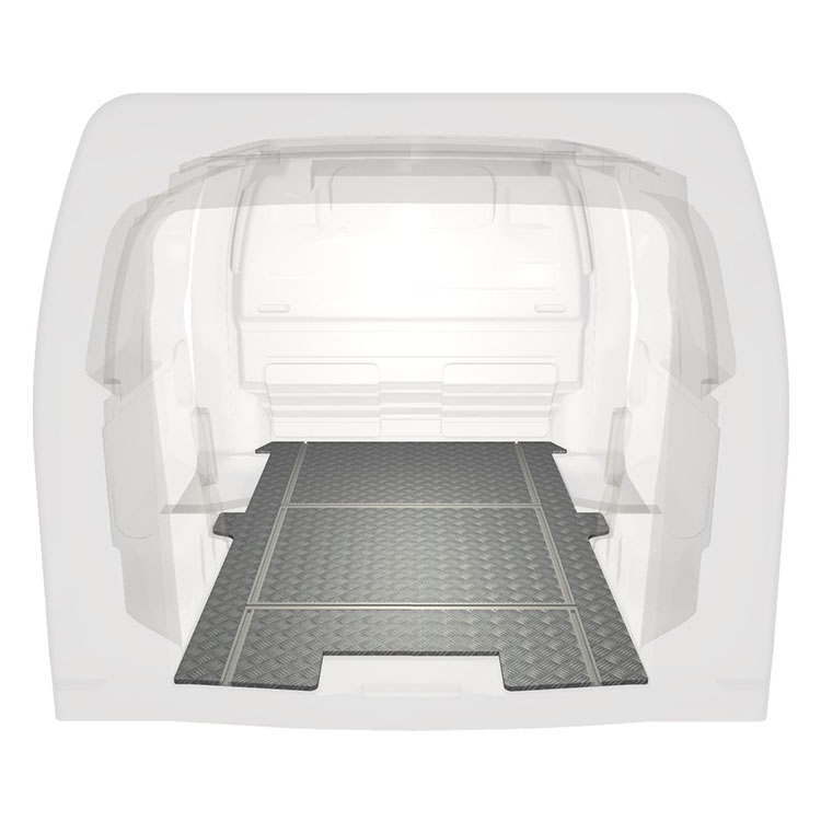 Lichtgewicht, robuuste bestelwagenvloer met dwarsrails voor een Citroën Jumpy / Peugeot Expert / Toyota ProAce met antislip-instaplijst van aluminium en cargorails (in de lengte en in de breedte) voor een snelle en veilige installatie van inrichtingssystemen en andere accessoires.