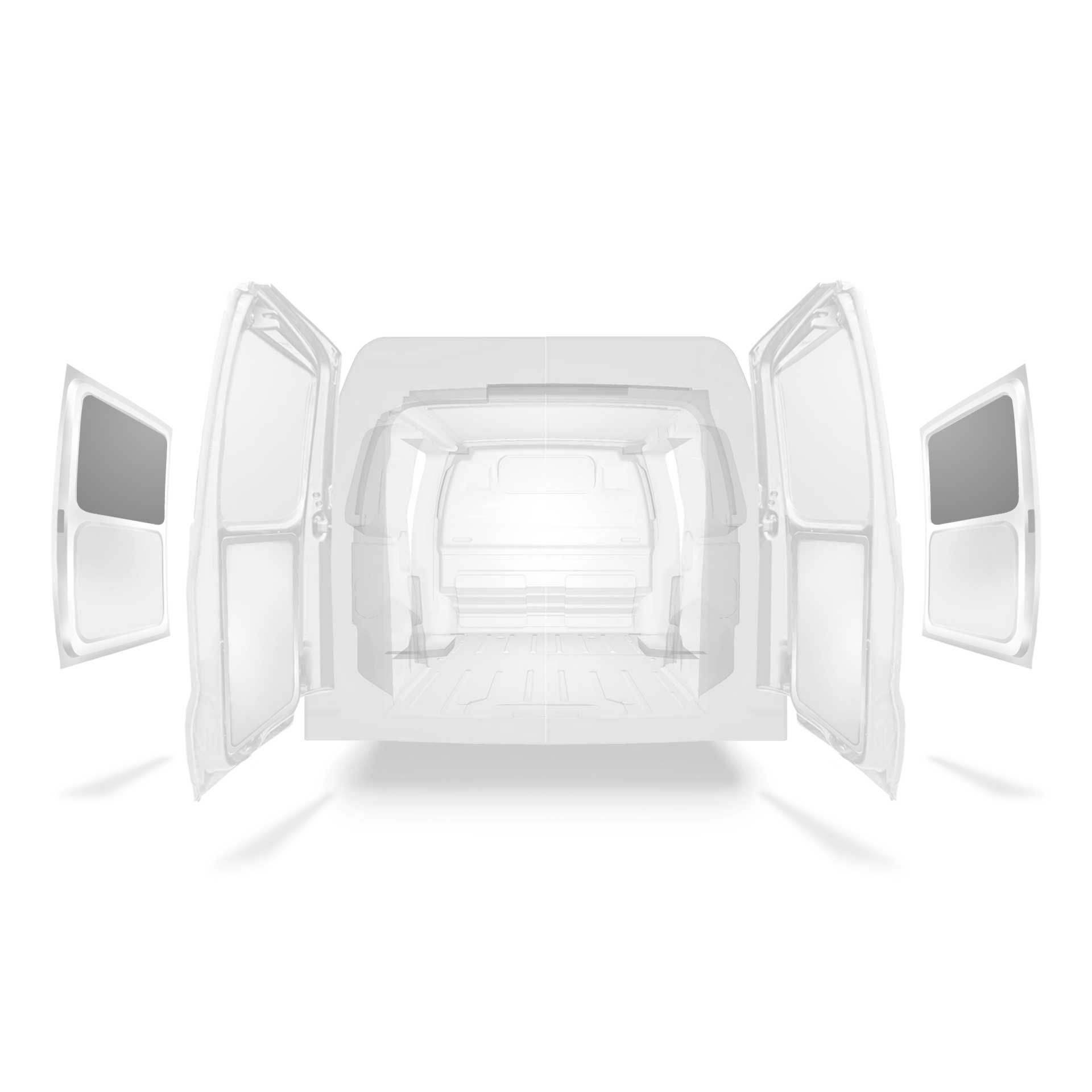 Lichtgewicht bekleding voor het bovenste gedeelte van het zijportier van een Citroën Jumpy / Peugeot Expert / Toyota ProAce met dubbele zijportieren. De bekleding vermindert slijtage van het interieur, en helpt de restwaarde van de bestelbus te behouden.