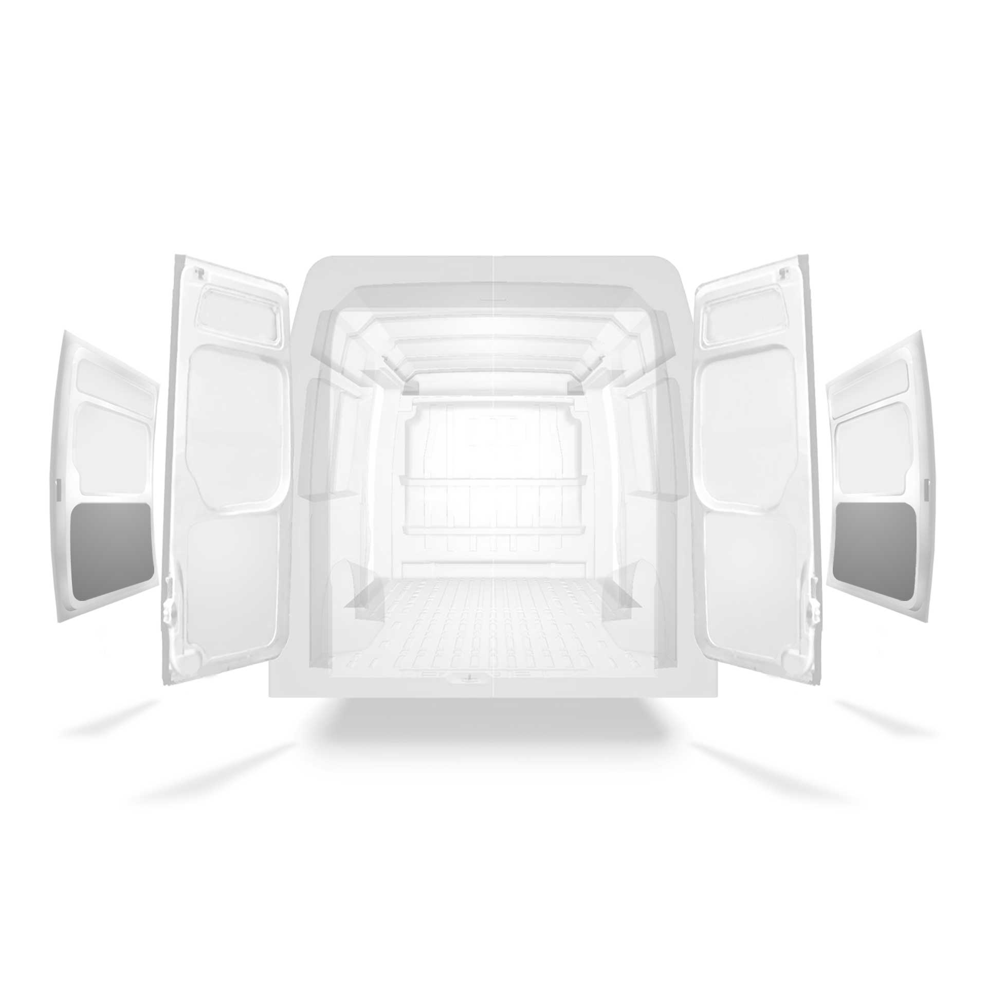 Lichtgewicht bekleding voor het onderste gedeelte van het zijdeur van een Citroën Jumper / Peugeot Boxer / Fiat Ducato met dubbele schuifdeuren. De bekleding vermindert slijtage van het interieur en helpt om de restwaarde van de bestelwagen te behouden.