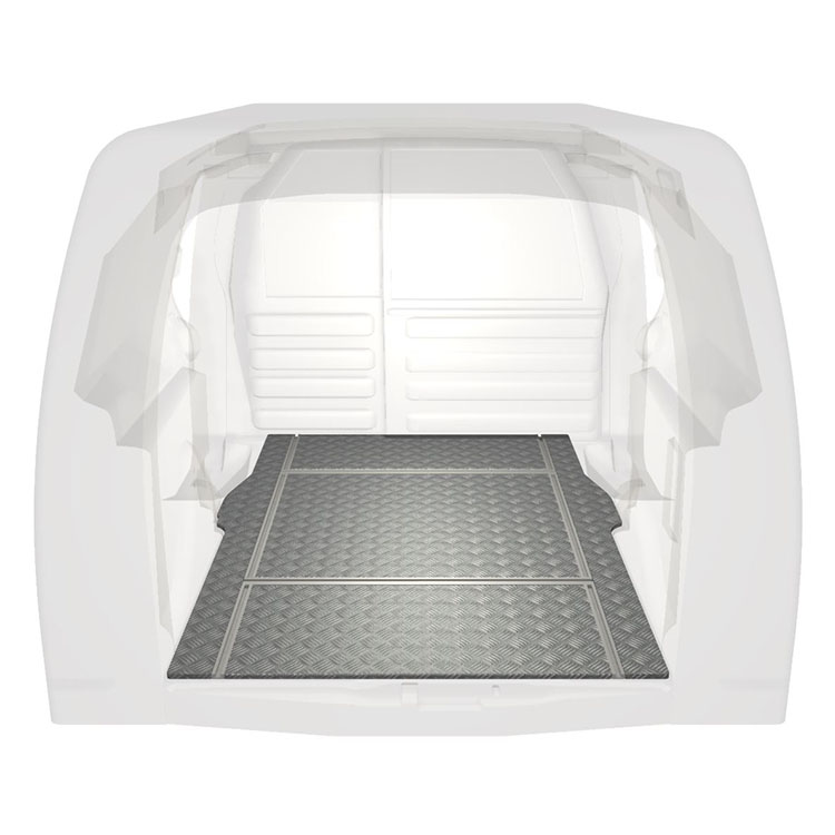 Lichtgewicht, robuuste bestelwagenvloer met dwarsrails voor een Citroën Berlingo/Peugeot Partner met antislip-instaplijst van aluminium en cargorails (in de lengte en in de breedte) voor een snelle en veilige installatie van inrichtingssystemen en andere accessoires.