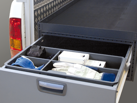 Bergruimte op twee niveaus: groter of zwaarder materiaal kan onder in de lade en kleiner materiaal in de inzetbak boven op de lade.