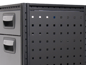 Gereedschapspanelen voor modules zoals ladeblokken en kastjes boven wielkasten. In de openingen kunnen accessoires zoals afvalmanden en formulierhouders worden bevestigd. Met behulp van gereedschapshouders wordt zo uw gereedschap flexibel en toegankelijk opgeborgen. De gereedschapspanelen worden bevestigd met clips.