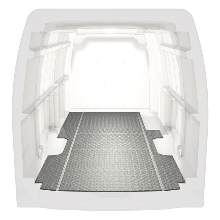 Lichtgewicht, robuuste standaard-bestelwagenvloer voor een Renault Master / Opel Movano / Nissan NV400 met antislip-instaplijst van aluminium en cargorails (in de lengte) voor een snelle en veilige installatie van inrichtingssystemen en andere accessoires.
