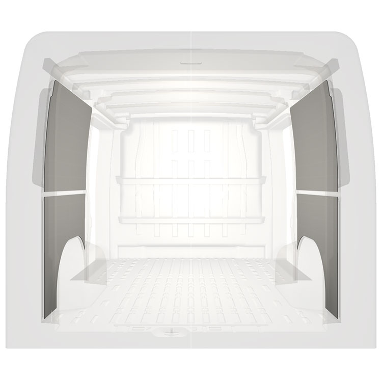 Lichtgewicht voorgesneden bekleding voor de binnenwanden van een Citroën Jumper / Peugeot Boxer / Fiat Ducato met dubbele zijportieren. De bekleding zorgt voor een lichte, aangename werkomgeving en is makkelijk schoon te vegen.
