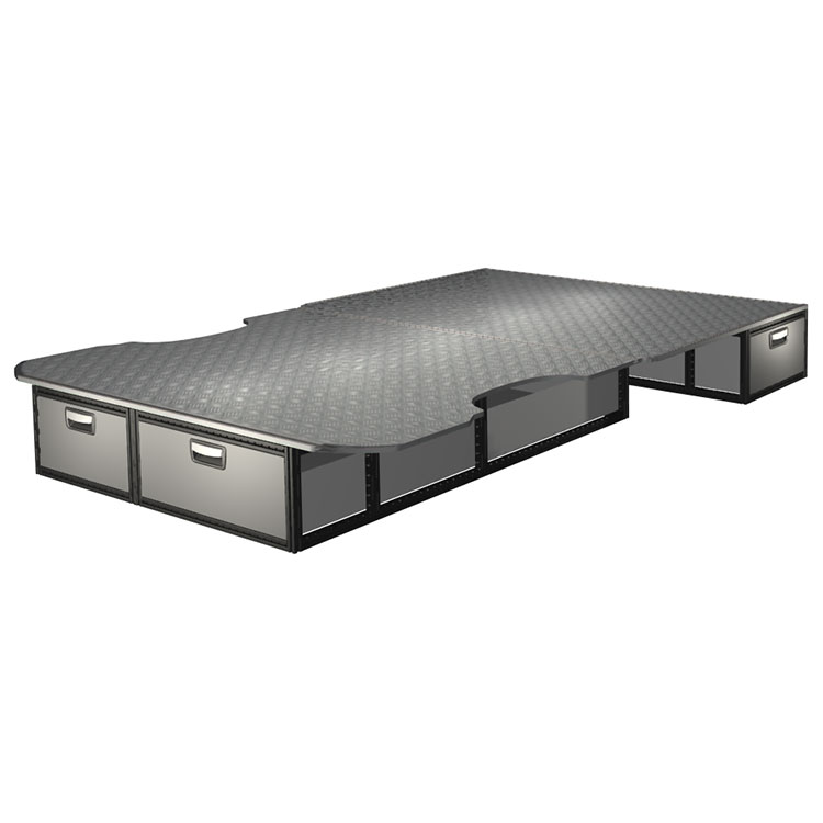 The kit is designed to be fitted on top of a wooden floor. The double floor is equipped with rails for easy installation of vehicle racking, and edging strips for a nice finish.